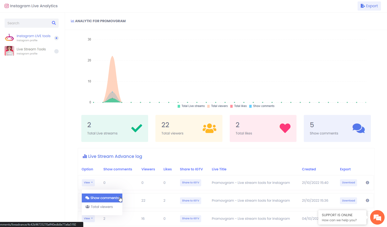 Get advanced analytics. See, analyze and export all the comments, viewers and likes from your live streams.