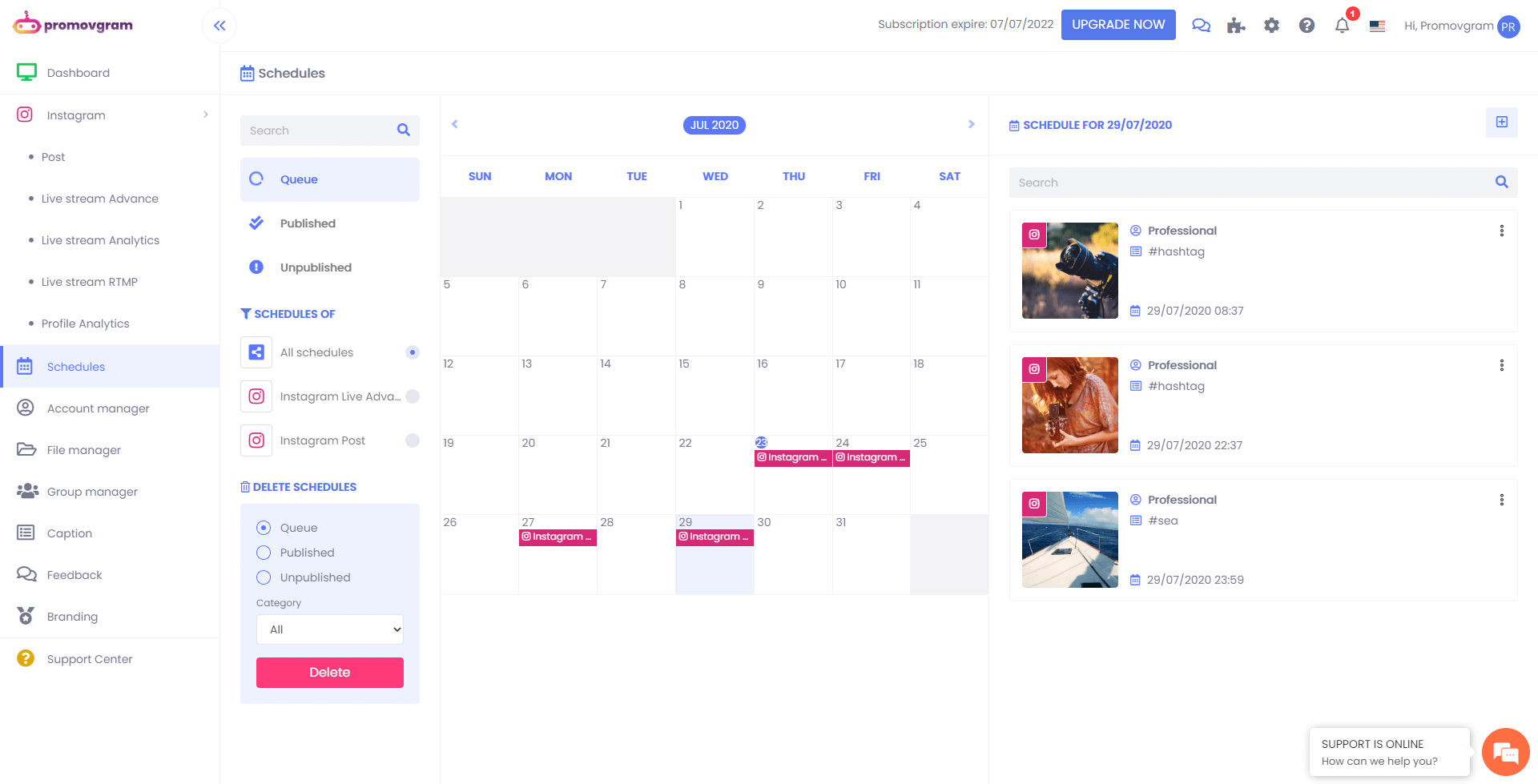 - Schedule: photo, video, live